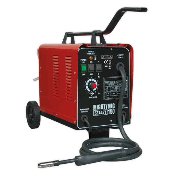 Professional Gas/No-Gas MIG Welder 150Amp 230V One of our professional MIGHTYMIG range this compact gas/no-gas welder offers excellent performance at an extremely competitive price. This unit is set up ready to go in gasless mode but can also be switched easily to use with gas by a simple change of polarity and purchase of a Gas Conversion Kit – Model No. 120.802032. Supplied with comfort grip non-live torch, 1.8mtr earth cable, 1mtr gas hose, 0.45kg flux cored wire and 0.9mm contact tip.