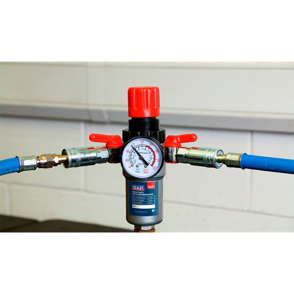 - Heavy-duty aluminium alloy valve assembly with integral filter and water trap.
